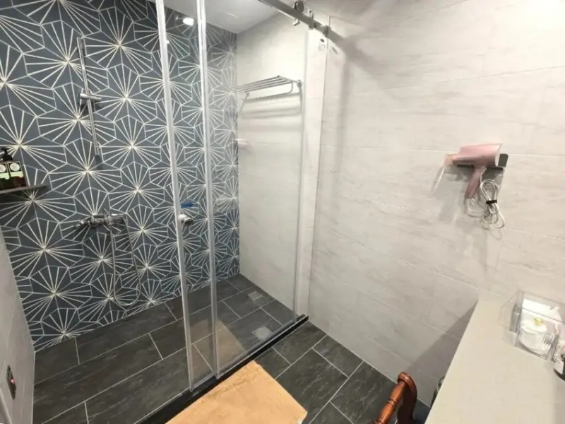 打開浴室門,一走進去就讓人覺得超加分。獨立的淋浴間,整個空間乾淨明亮又乾淨。有一點我必須特別稱讚,浴室的緊急呼叫按鈕,設計在靠近地面的低處,浴室最擔心跌倒的狀況,可以在必要時刻快速按緊急按鈕求救,店家不只在外觀和服務上用心,這安全細節都不馬虎。