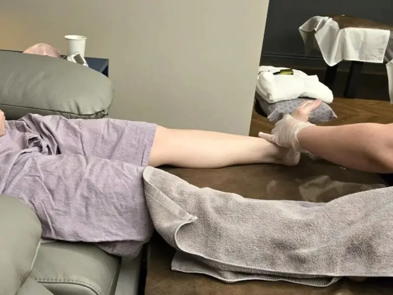 整個體驗從溫水泡腳開始,按摩師會倒入泡腳粉,提升循環、緩解緊繃,雙腳泡進熱水中瞬間釋放了一整週的壓力,真的是療癒從第一秒就開始。過程中如果覺得水溫不適,也可以隨時反應調整,服務很貼心。店家也會同時提供毯子放置於桌邊,如果覺得太冷,在按摩的同時可以蓋著毯子閉目養神享受。
