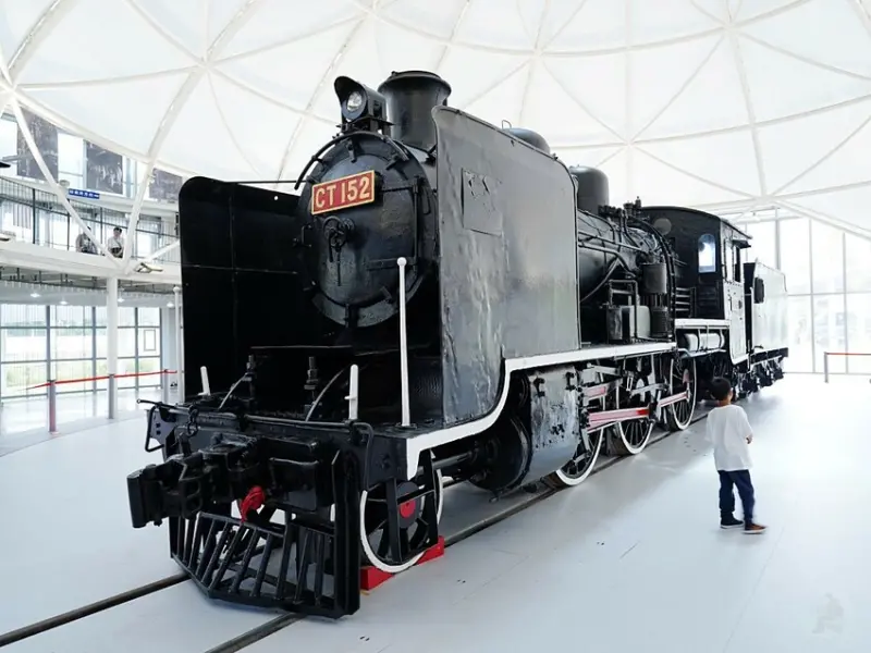 CT150 型蒸汽機車原為日治時期引進的 500 型機車,戰後由臺灣鐵路管理局接收並改稱為 CT150 型。這款機車與日本國鐵的 8620 型蒸汽機車同型,於 1919 年至 1928 年間,由日本的汽車製造、川崎造船所、日立製作所、日本車輛、三菱造船所等公司共生產了 43 輛,是臺灣鐵路中使用數量最多的客運用蒸汽機車之一。其車輪配置為 2-6-0,車長約 16.8 公尺,車高約 3.8 公尺,整備重量達 83 噸,具有強大的牽引力,曾是臺灣鐵路運輸的重要主力。目前,園區內展示的 CT152 號機車,為該系列中保存最完整的一輛,退役後曾放置於嘉義扇形車庫,後來轉移至苗栗火車頭園區靜態保存,成為鐵道迷們朝聖的熱門景點。