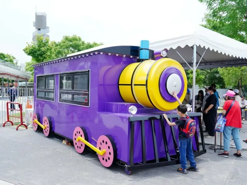 讓人眼睛一亮的是,苗栗火車頭園區竟然是用一台卡通風格的蒸汽火車當作售票口!目前園區還沒有正式的售票亭,所以用這台造型可愛的火車車廂來賣票,非常適合親子拍照打卡。