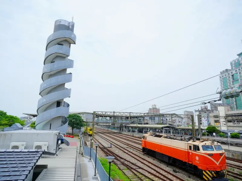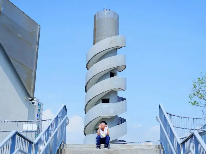 而且在火車頭一村這邊,還能找到絕佳的拍照角度,可以和螺旋塔一起合影喔!這座螺旋塔造型獨特,是苗栗火車頭園區一帶的最佳打卡點之一,不管是親子合照還是網美風自拍都很棒。