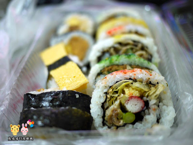 種類以花壽司及海苔壽司居多,有鮭魚、芥末魚子、肉鬆、火腿、玉子燒等口味,其中芥末魚子讓我覺得蠻嗆的,可能是平常自己很少吃芥茉的關係。