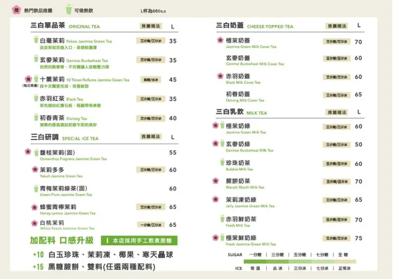 三白茉莉茶飲專門店 菜單價錢