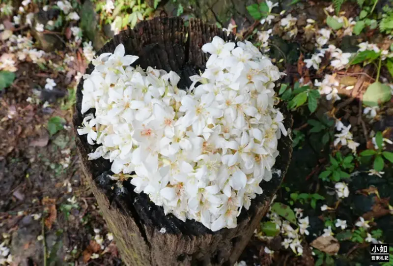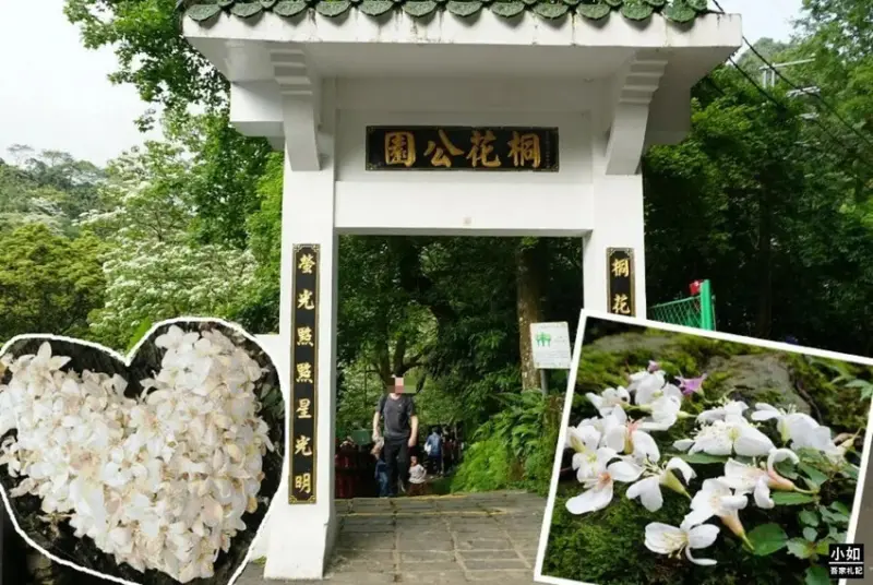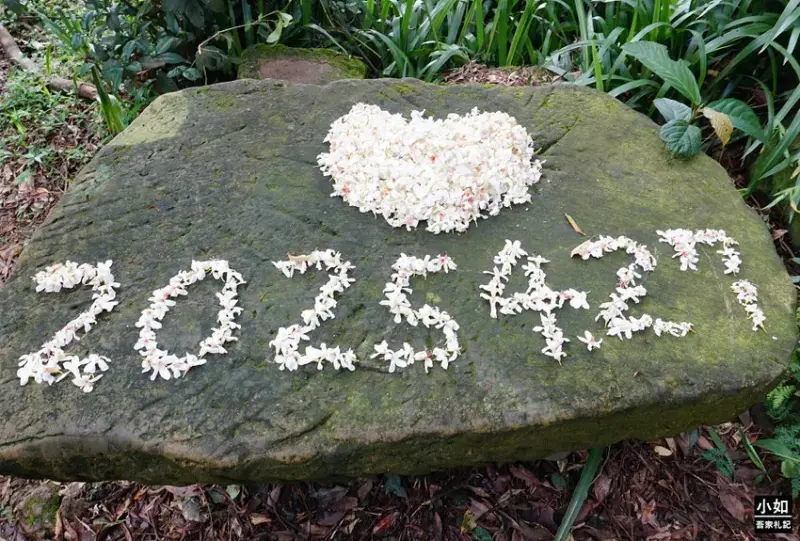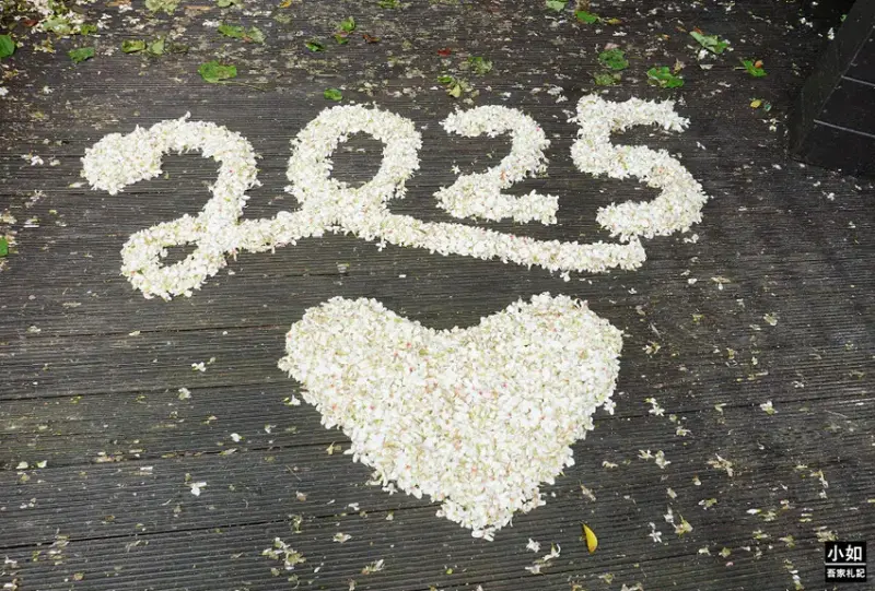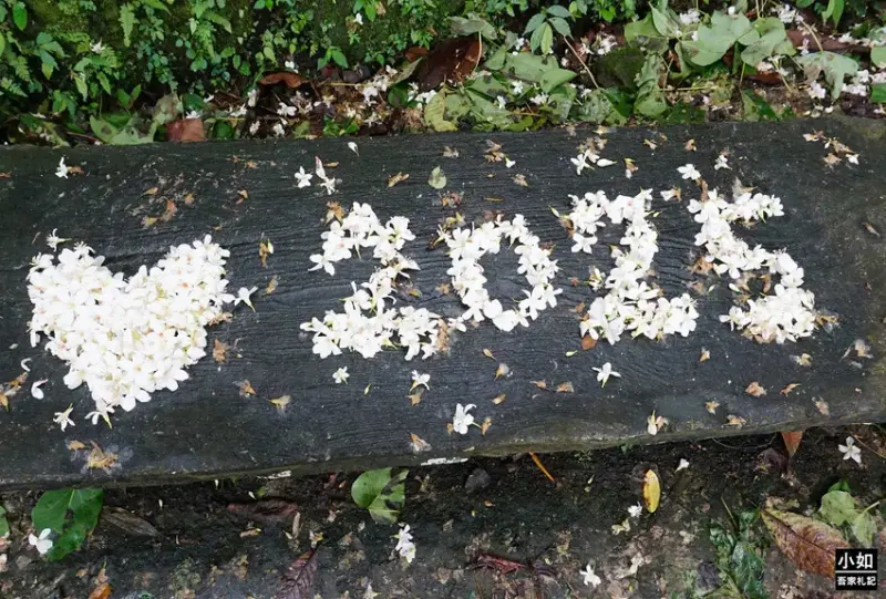獅子亭旁有前人排的桐花字樣也太厲害太有心,用了超多桐花的量讓大家可以拍照留戀,