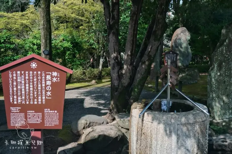 神社「手水舍」(用來供參拜者洗手和漱口的石盆)裡的「長壽之水」是發源於阿蘇山的地下泉水,一旁的松樹則是自 17 世紀上半葉從細川忠利的盆栽培育而來。