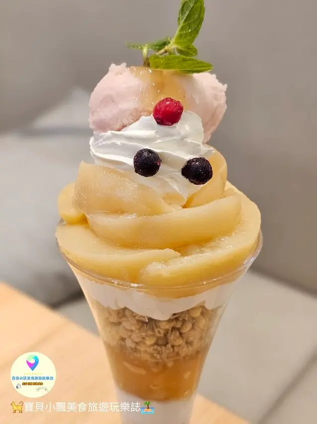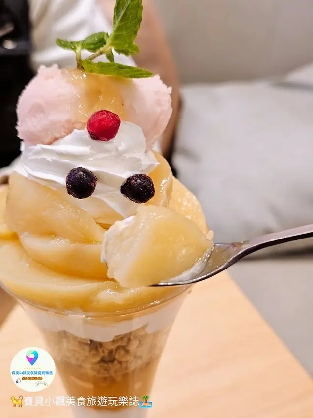 冰淇淋、桃子果泥和鮮奶油,中間還加入了酥脆的餅乾,口感層次豐富