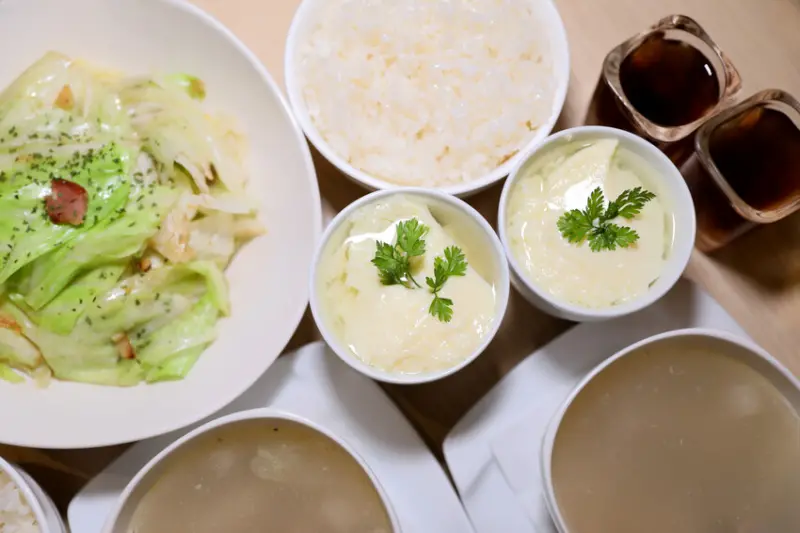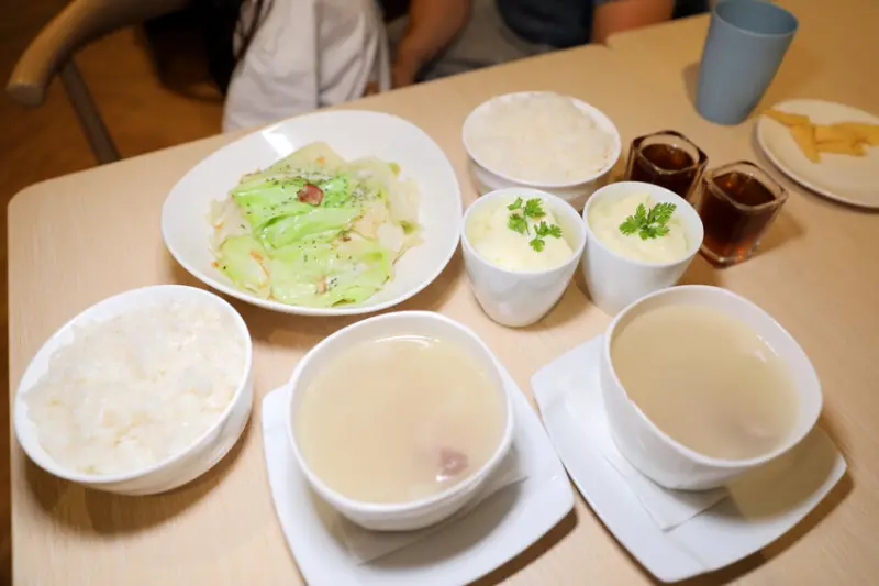 雙人套餐八道料理包含蒸蛋、湯、青菜、白飯、主食、海鮮、甜點、飲料,