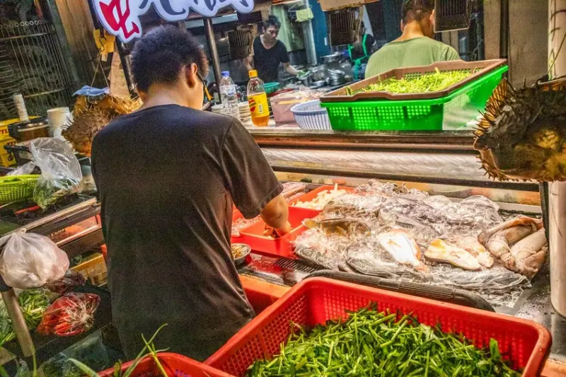 講到菜單,「福龍宮廟口快炒」的價位在中壢的快炒店裡,算是中等價位。不過,菜色種類超級多,而且每一份的份量都不小氣。吃快炒果然還是要揪多一點人一起來,這樣才能點更多樣,吃到爽啊。除了菜單上的固定班底,攤位前的小白板還會寫上今天的限定隱藏版菜色。特別的是,他們還有現撈仔鮮魚料理喔。這些新鮮的魚就放在冰箱裡,你可以自己去選想吃的魚。