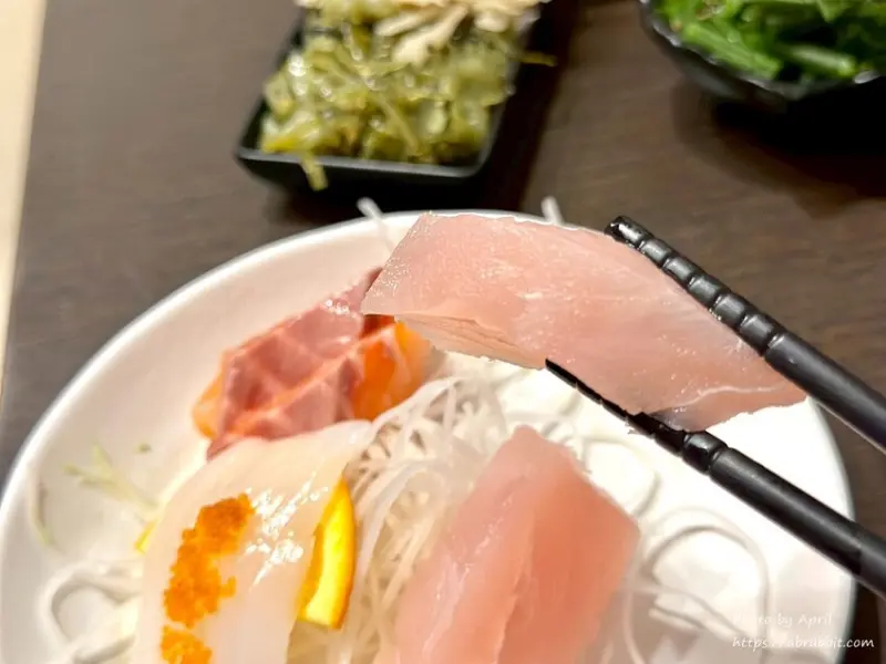 一份7片只要150元。這個價位真的太便宜了,而且生魚片切得超厚實的,看到那個厚度心情就變超好啦。裡面有鮭魚、鯡魚、旗魚跟花枝,每一種都讚讚的。![]()