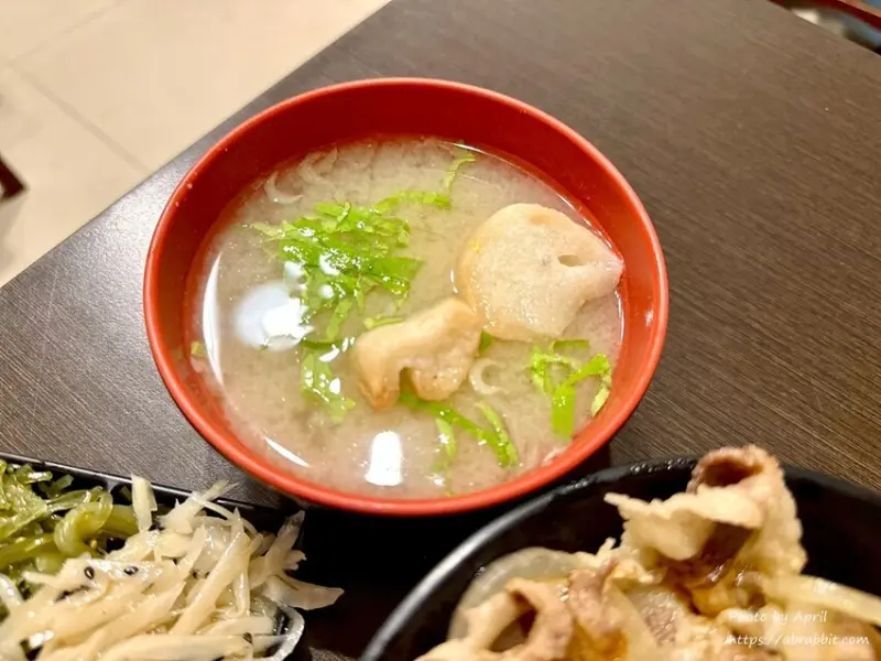 丼飯附的味增湯,裡面有烤麩跟海帶芽,它們把湯汁都吸得飽飽的,口感軟軟嫩嫩的,味增湯喝起來也很溫潤好喝喔。![]()
