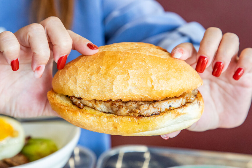 一樣是用豬仔包做的,「豬扒包」。如果豬仔包是夾了豬扒,就變成豬扒包啦。裡面夾著嫩煎的豬扒,外層酥脆,內部鬆軟,食材看起來很簡單,但組合起來就是非常美味。