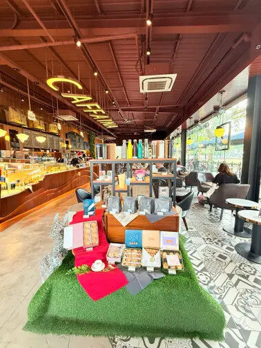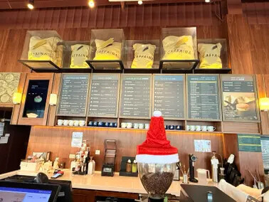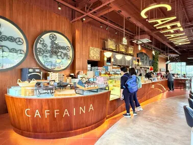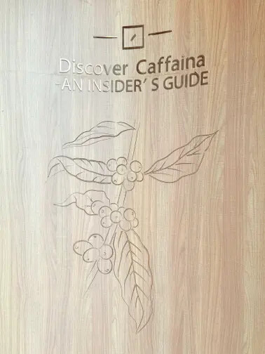 卡啡那文化探索館的室內設計風格,天花板以及櫃檯就有一個大大的CAFFAINA。食物飲料是在櫃檯先點餐付費,然後在櫃檯自取