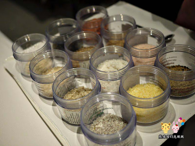 接下來就是今天的正餐,當正餐上完後,服務生會端上12種鹽讓你挑選,我的魚是搭配檸檬跟海藻。