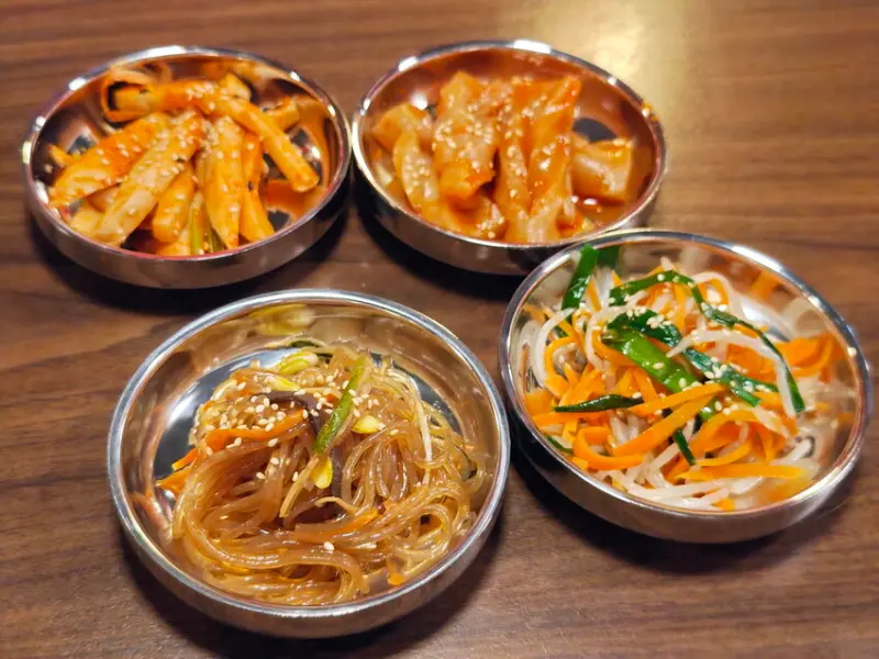 每次吃韓式料理,最愛之一就是這些好吃的小菜,Q彈有勁的韓式冬粉、爽脆可口的豆芽拌紅蘿蔔絲、吃了就停不了口的杏鮑菇、美味不怕胖的蒟蒻。