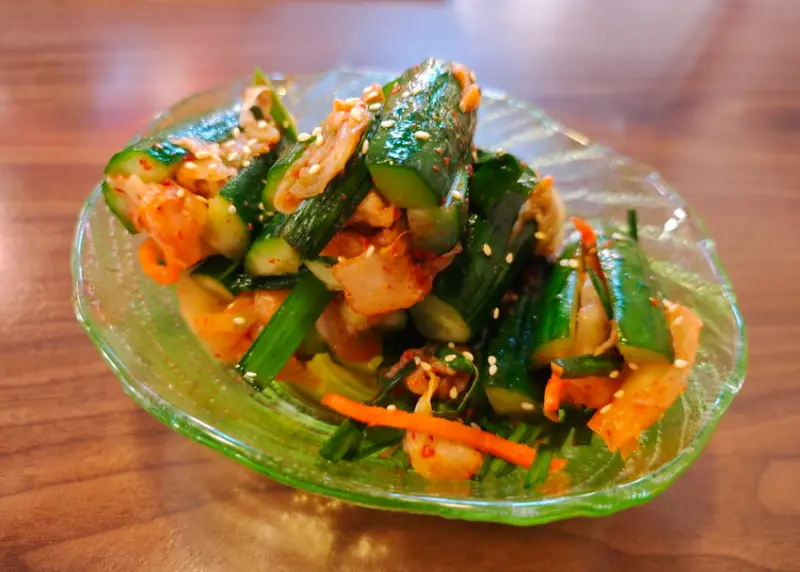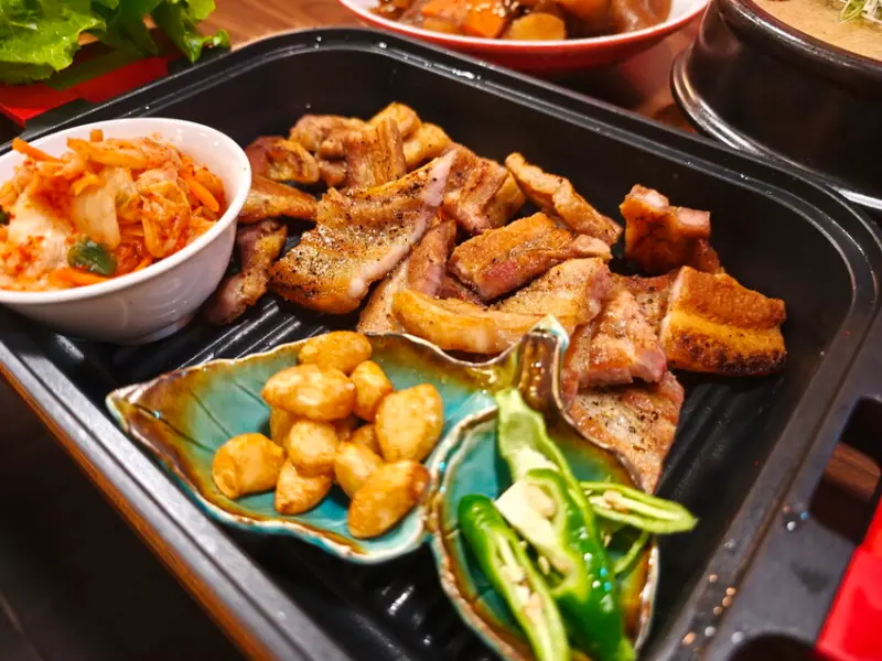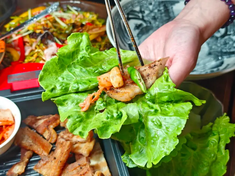 夾起一片剛烤好的五花肉,包進清脆爽口的生菜裡,再加上一片辛辣帶勁的蒜頭、微酸爽口的泡菜,,一口咬下,層層風味在嘴裡爆開。油香、菜脆、蒜辣、泡菜酸辣融合得恰到好處,既滿足又清爽,毫不油膩。那種多層次的咀嚼感與鮮明的韓式風味,讓人大呼過癮!