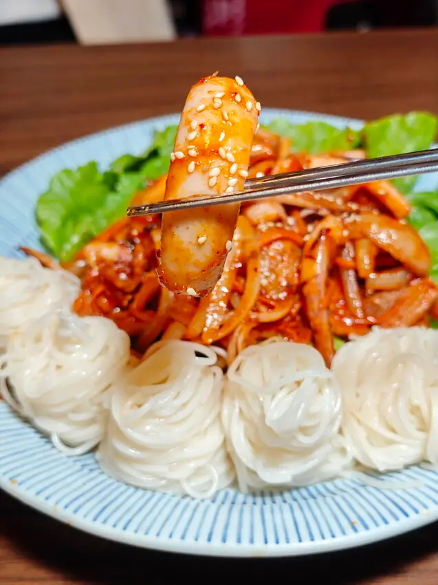 很喜歡吃韓式料理的魚板,魚板跟彈牙有嚼勁的年糕一起在甜辣濃郁的辣炒醬中慢慢煮透,吸收了醬汁的美味的魚板,跟年糕、雞蛋、冬粉一起享用。