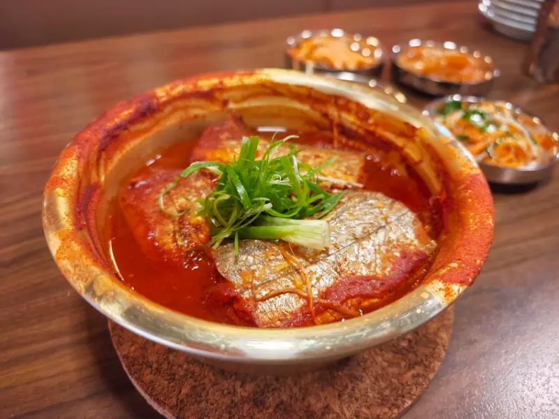 第一次吃這樣煮白帶魚,以前吃的都是煎的白帶魚,白帶魚有豐富的膠原蛋白,聽韓濟蔘雞湯專門店說女生吃了養顏美容,趕緊搭配底下的豆芽菜多吃幾口。