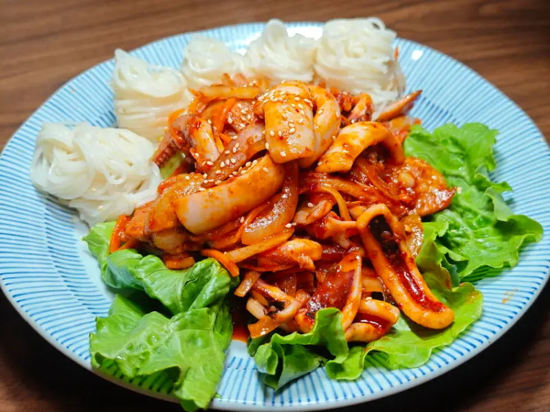 非常下飯的一道菜,將魷魚跟豬五花、紅蘿蔔、洋蔥與韓式辣醬一起拌炒,最後撒上芝麻,吃起來甜甜的帶一點點辣,魷魚新鮮好吃。