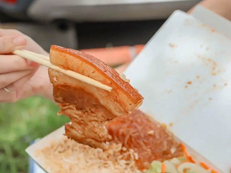 最後一個是爌肉飯。一份也是$100元。這個爌肉飯呢,搭配了一大塊肥瘦相間的爌肉。那個肥肉跟瘦肉的比例,大概是六四波啦。爌肉燉煮的時間很夠,吃下去你會嚐到肥肉的油脂在嘴裡化開的那一瞬間,然後瘦肉紮實的口感接著會給你帶來一股暖暖的滿足感。它的味道不會太濃重喔,鹹度抓得剛剛好,就是一個很不錯的古早味啦。