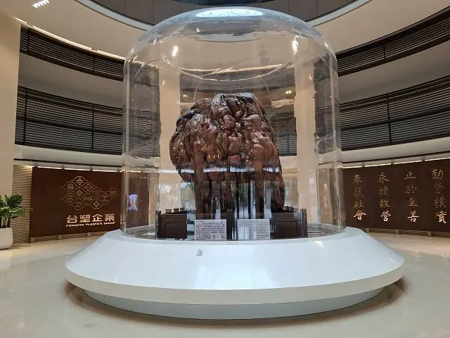 走入「台塑企業文物館」,一樓大廳正中央是有五萬年歷史的奇木,象徵著屹立不搖永續經營的企業精神。