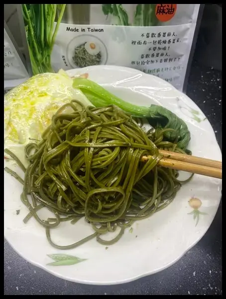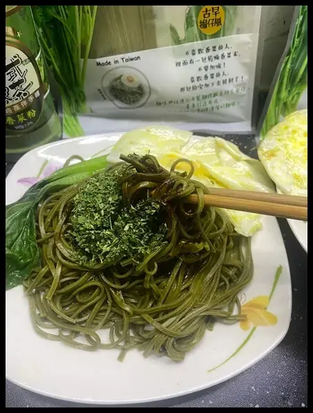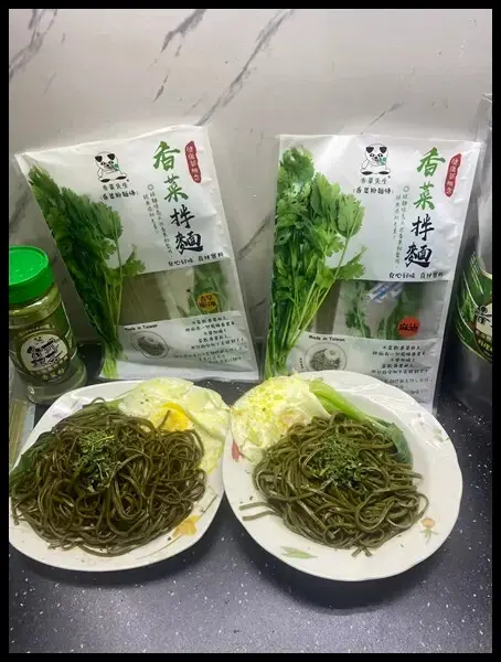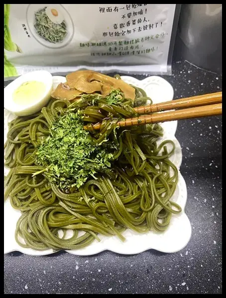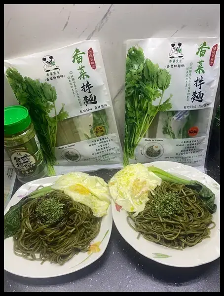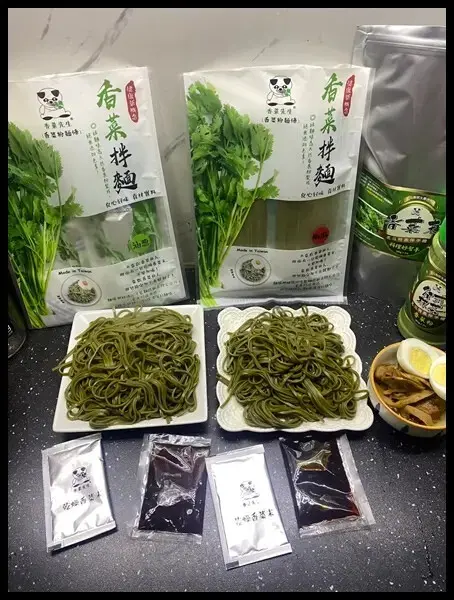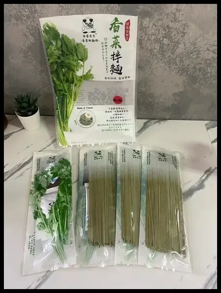 首先,一定要先來聊聊他們家的「香菜拌麵」啦!這個「香菜拌麵」的麵條本身就是綠色的喔,它是用天然的香菜粉做成的耶!口味也超多的,有油蔥、椒麻、麻油、還有古早擔仔風味的喔!每一個口味都超誘人的啦!一袋裡面有四包喔,每一包都很貼心,裡面都有一份麵體、一份醬包,還有一包香菜末喔!包裝上都把成分、營養標示、怎麼煮、還有注意事項寫得超清楚的,真的很用心耶!而且就算是用宅配寄送,麵體也包得很完整,完全沒有斷掉的情況喔!煮這個「香菜拌麵」超級簡單的,從麵條到醬汁,品質都很好,我們不用花太多功夫,看你喜歡麵條煮軟一點還是Q一點,大概煮個五到六分鐘,熱騰騰的香菜乾拌麵就可以輕鬆上桌了!
