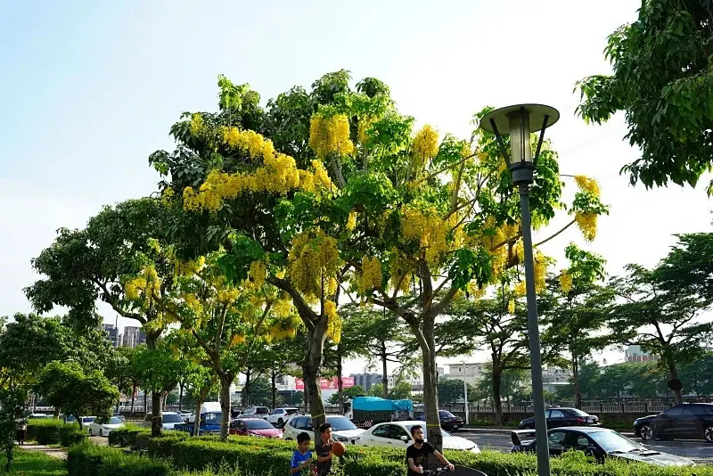 每到阿勃勒花季,東英公園的兒童溜滑梯周圍便會開滿一串串金黃色的花朵,就像「黃金葡萄」掛滿枝頭一般,隨風飄落時,彷彿真的下起了浪漫的黃金雨!那片閃耀的金黃花景,真的美得讓人忍不住駐足欣賞,也成為許多親子遊客拍照打卡的熱門角落。