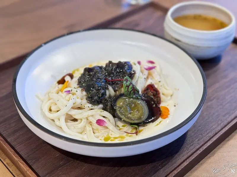 這是我朋友點的,聽名字就很特別。它是皮蛋豆漿豆腐跟冷烏龍麵的結合,巧妙地把中式跟日式口味融合在一起。朋友說吃起來口感非常清爽迷人,很適合夏天想吃點輕食的時候。