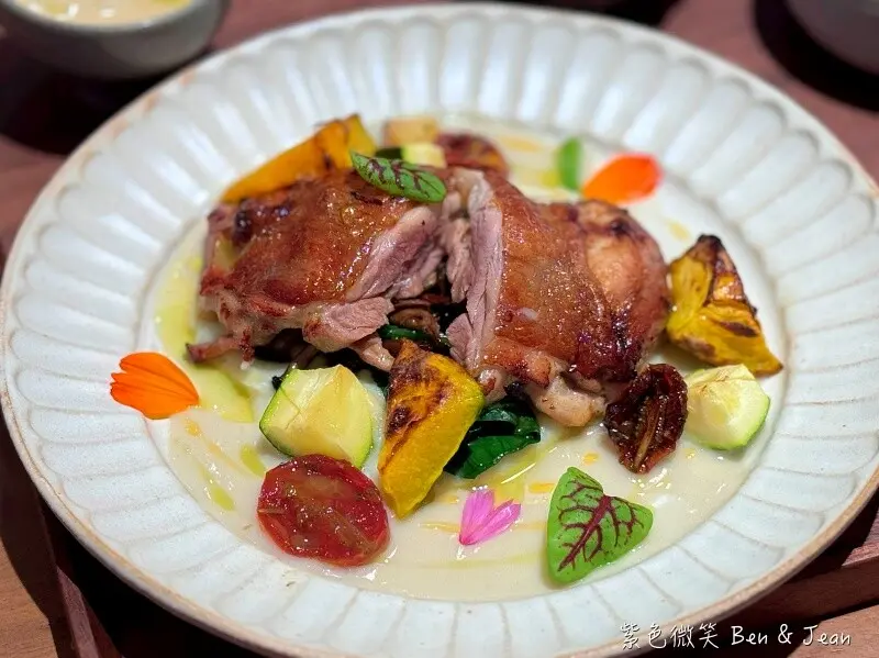 套餐內容都差不多,都會有滑嫩細膩的蒸蛋跟湯品。主菜是香煎比目魚,感覺是用烘烤的方式處理的,魚肉烤得外酥內嫩。吃的時候可以搭配主廚特調的醬汁,真的會讓人覺得好滿足。這道的口感也是屬於清爽路線的。