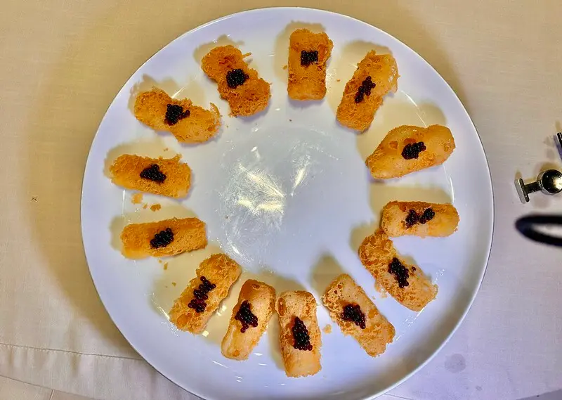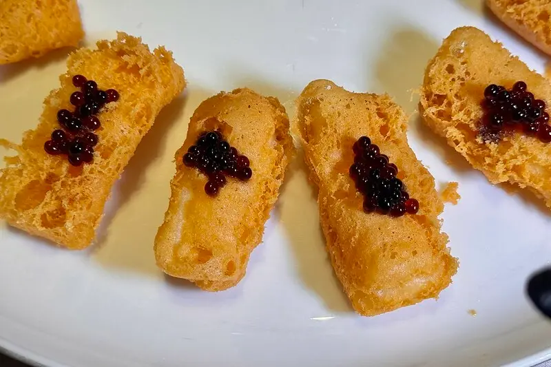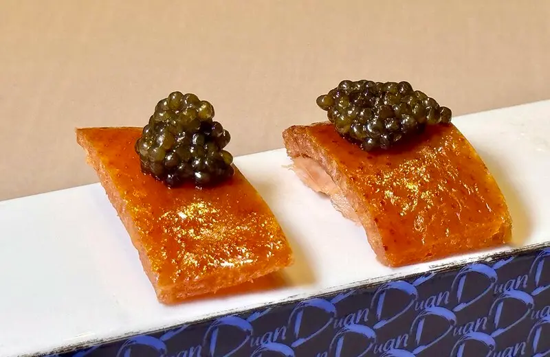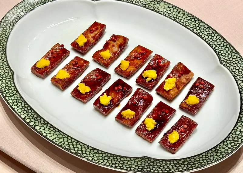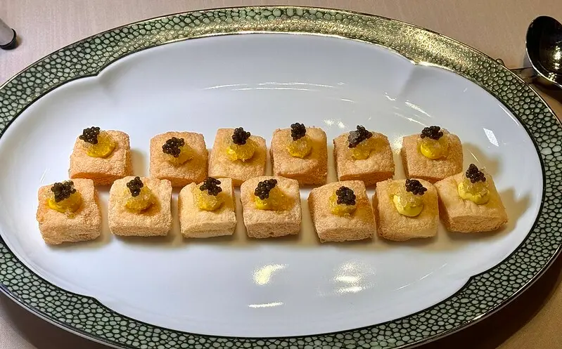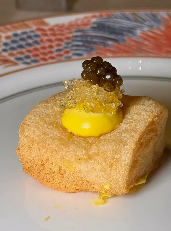 魚子醬皮蛋脆皮豆腐,這道大概是我見過最美也最華麗的臭豆腐,說來它的模樣反而比較像台灣的臭豆腐,雖然湊近聞也不怎臭...酥炸帶點澎鬆口感的臭豆腐,上面是蛋黃醬吃起來有一點像加了少許芥末的微嗆,比較有意思的是中間的蛋白晶凍,像是加了一點點醋,咬開時多了一點點討喜的微酸,上面則是提供鹹元素的魚子醬,於是這一口臭豆腐就有了甜、酸、鹹等層次相托,不過味覺後端倒是全還給了油香的臭豆腐滋味。