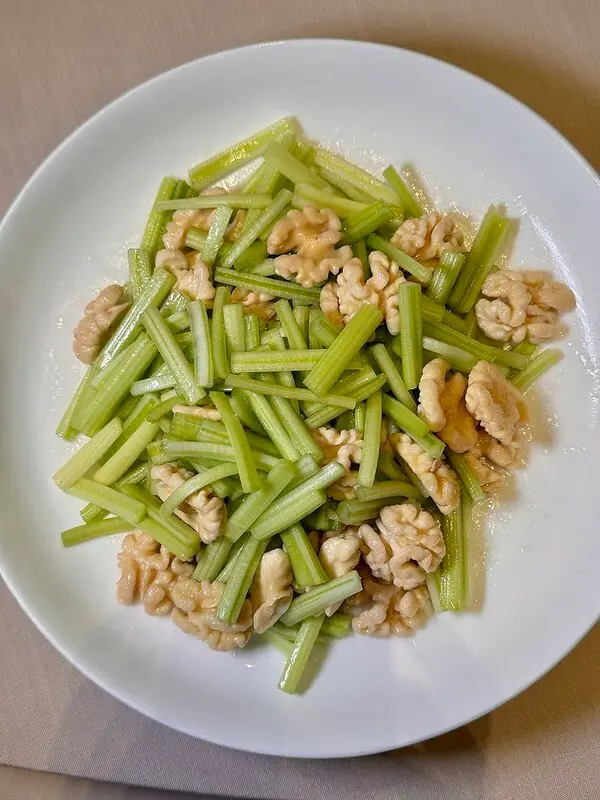 章丘鮑芹拌桃仁。三道口味越來越重的前菜後是產自山東章丘的鮑芹(產自章丘鮑家村而得名,據說該村種芹菜有100多年的歷史),過油後顯得翠綠,咬下微帶水份的爽脆,芹菜的香氣十足十,搭配飽實口感的核桃,同樣過油後脆糯香甜,一口鮑芹一口核桃一口桌上的好茶,慢慢將味覺拉回平淡。