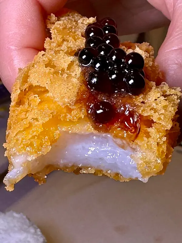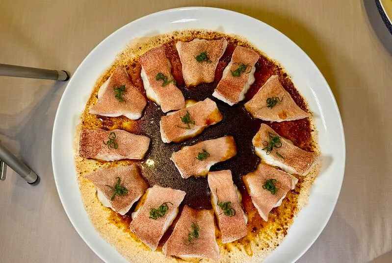 天婦羅花膠配意大利黑醋,這道大概是我吃過無數花膠料理中,最特別也最喜歡的,外衣炸的酥綿甜糯,裡面三指寬的大花膠花膠像糯米般的綿化,化開的過程好像和唇舌都緊緊粘在一起,天婦羅的油香花膠的油甜,完全捨不得開嘴(怕味跑了),上面義大利黑醋做成晶球正讓扮演了生津解膩的功用,讓人一口欲罷不能,二口意猶未盡。好吃得亂八九糟!!!