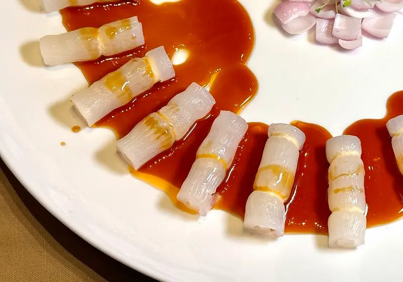 薑蓉沙窩青蘿蔔,就服務生的說法這產自天津的沙窩蘿蔔(冬天才有的山東特產,有600年的種植歷史)是高價值高營養的食材,因為吃起來口感有一點像水果而有沙窩蘿蔔賽鴨梨的說法。這邊取比較青的沙窩蘿蔔增加清爽脆的口感,也多了一點前咀嚼微青澀,加上薑蓉及醋調味。做為最後一道前菜極為舒服。