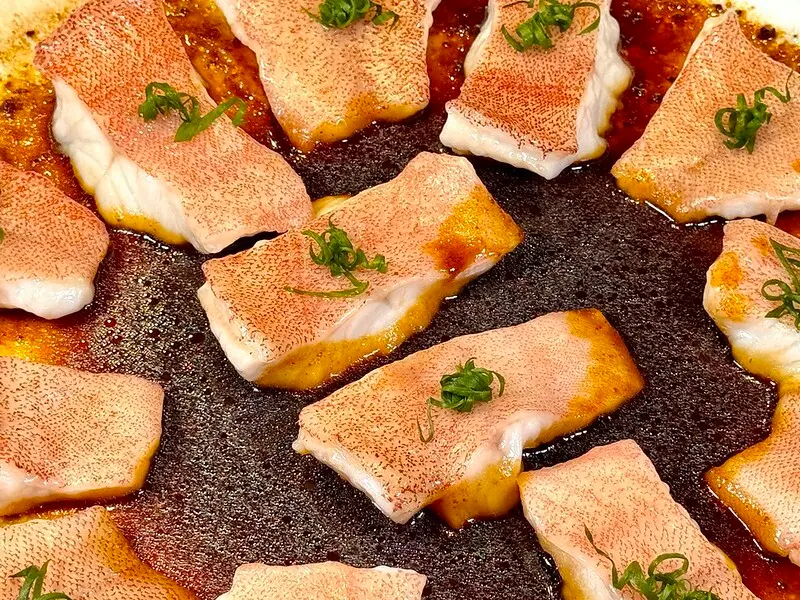 紅辣椒脆皮叉燒用的是豬頸肉,我不知道這是不是從粵菜演變過來的叉燒,但看起來比較像有一點厚的肉乾,但吃在嘴裡又確然是叉燒的香甜無疑,不過豬頸肉的特色油脆不甚明顯,上面點綴的是紅胡椒和黃芥末,同時還淋了一點點像是老抽的醬油。整體來說算是視覺遠比味覺來的好的一道,我還是比較偏好原來的港式叉燒,除了搭配的風味多了一點微妙的變化。