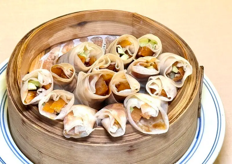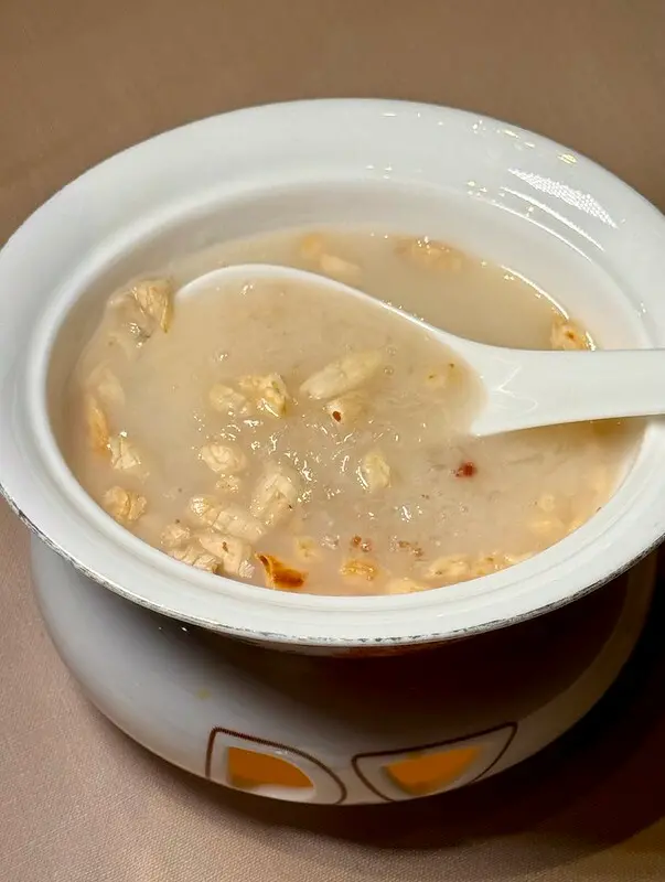 鳳蒸。本以為是燕窩湯,但服務生說是粥,我一臉疑惑的撈了一匙後,她接著說這粥是用用老母雞煨煮白米、糯米、糙米成粥,喝起來比台灣的稀飯(糜)還希,滿滿雞雞的鮮糯,北京有一個說法叫「泔」,上面再放上燕窩及米香,補滋養也增香添口感,十分特別的雞湯料理。