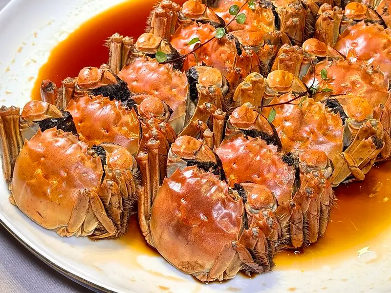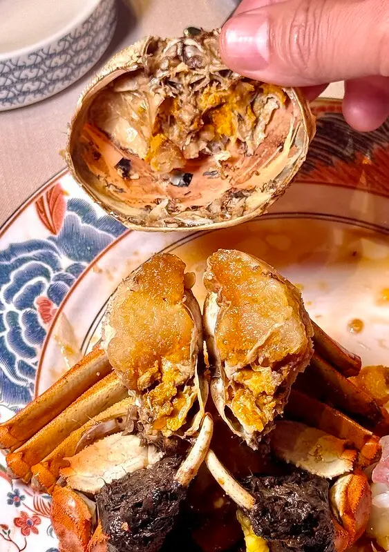 段譽的熟醉蟹,這邊的段譽指的不是天龍八部那個會把妹的大理王子,而是這個品牌集團的創始人「段譽」,而這道熟醉蟹據說是他三道拿手料理之一。醉蟹通常是活的螃蟹生醃,但段三弟覺得不少人望生興嘆,於是改變了作法「先蒸再紹興醉醃」。說到這個熟醉醃的法,要特別說一下的是,醃製的過程是用兩種不同的酒(安徽老字號古南豐黄酒、紹興國宴古越龍山花雕兩種酒)分別扮演去腥苦增甘甜的功效,取其前選用的是五兩公蟹隻隻精神飽滿狀。這熟醉蟹的口感還是偏向生醃但半點沒有腥味,口感水嫩軟細,蟹膏因為吸足了兩種酒的香甜特別鮮美。連不敢吃生醃蟹的團員都直呼美味,招牌當之無愧。