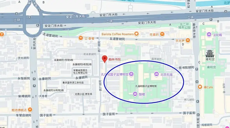 京艷 瀚林書院位於五道營胡同周邊,前面提過的「京兆尹」也在附近,整體來說就是緊依著北京國子監、孔廟,就接待人員的說法,這裡在清朝時也屬於國子監的一部份。店門取了翰林書院,自然是和翰林院(全國文人精英聚集之地)有關,而國子監等同於最高學府,雖然這個地方在各朝的地位與功能有所不同,但總之都是文人、科舉產出人材的地方。兩者的分別,有一個我覺得比較接近的說法(清),國子監相當於當代最高學府,出來的都是准公務人員,而翰林院相當於國務院(台灣行政院)辦公室,可參政論事,出來的都是部長、副部長級的(清代,六部的尚書、左、右侍郎)。