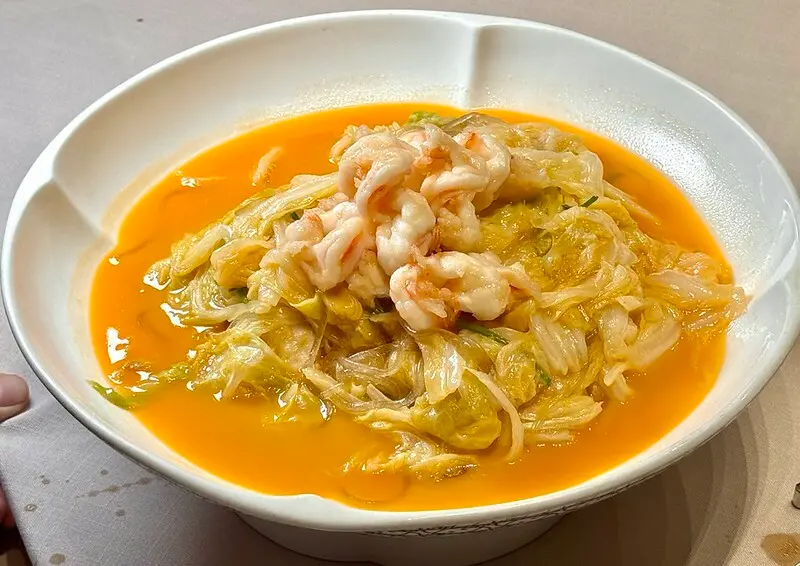 下面都是沒在菜單,主廚和寶豐旅遊幫團員加得菜。爛糊大蝦。爛糊指的是江浙的爛糊白菜,口感吃起來很像燉白菜,添上微辣的醬汁,說真的上面脆鮮甜的大蝦反而有一點可有可無。