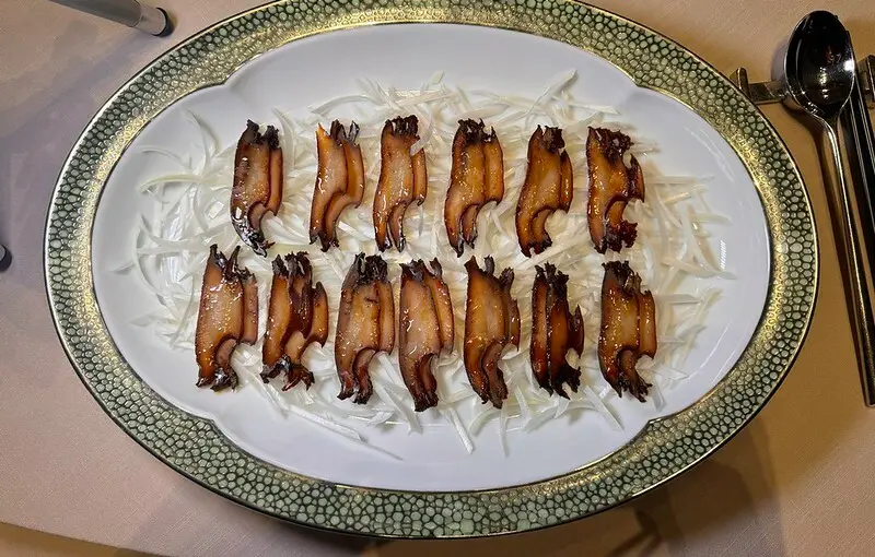 陳皮北滷二頭鮑魚,一般來說我們習慣說南滷北醬,但也許是京艷 瀚林書院標榜融合的新京菜故用了「北滷」?另外,這二頭鮑的吃法也跟我們高級粵菜的吃法不同,片成兩片相疊,看起來有一點乾入口卻相當滋潤,真有幾分像在吃滷味的口感,比較特別的是陳皮的輕香和適度的滷汁鹹香組合挺妙的,口感上的爽脆和整顆鮑魚滷煮後的軟脆有少許不同。