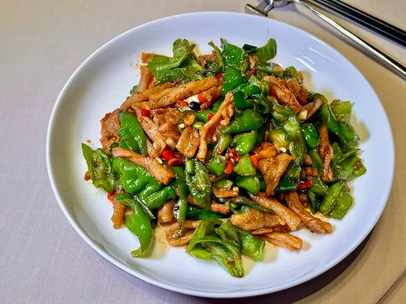 湖南辣椒炒豬花膠,湖南辣炒肉在台灣想吃也不難,但如果炒的是豬花膠就比較少見了,其實所謂的豬花膠指的是豬腳筋,過油後的腳筋切段,再丟入青紅辣椒,以湖南的手法爆炒,鑊氣十足之餘吃得到腳筋的軟綿,也嚐得到青紅椒的爽脆,當然不可少的是湖炒辣炒的辣。過癮。