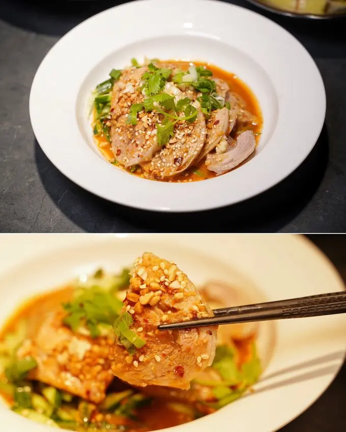 冷盤「川香口水雞」去骨雞腿相當彈牙多汁,吃起來充滿花生堅果香氣,還帶點紅油的麻辣感,搭配爽脆的小黃瓜,非常有層次感。
