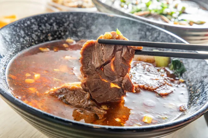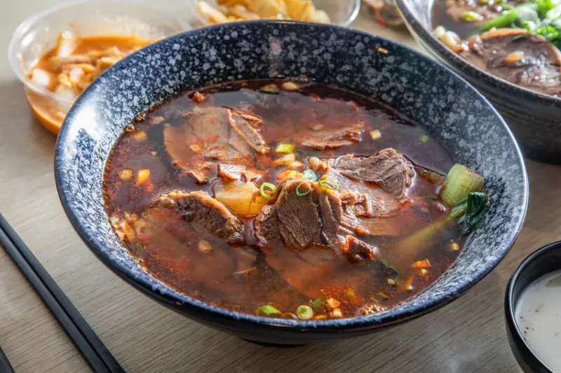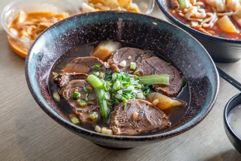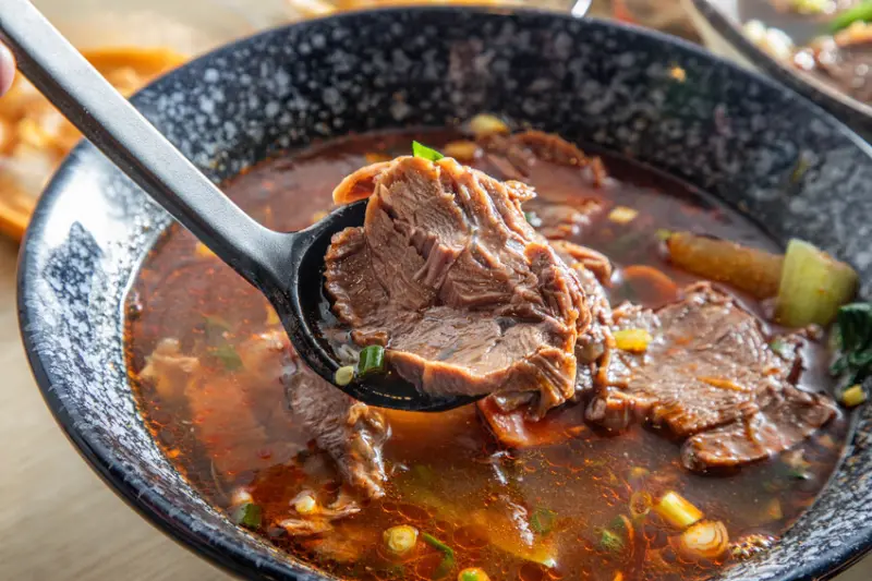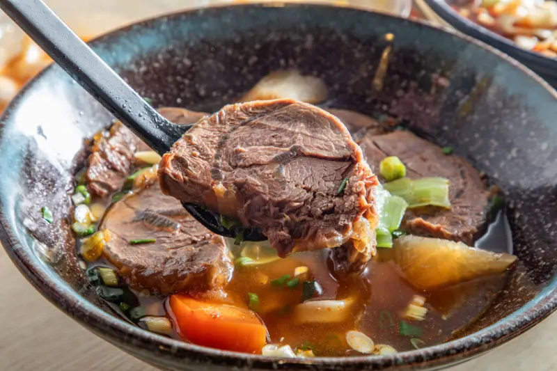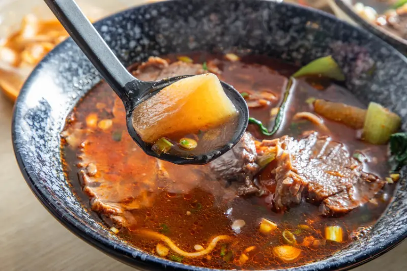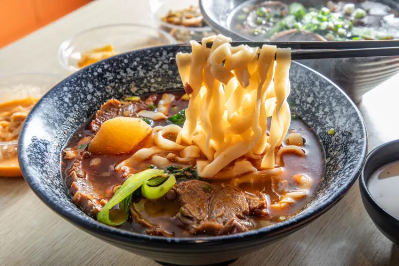 如果你是無辣不歡的朋友,那一定要點「牛吃嫩草牛肉麵館」的川味麻辣牛肉麵來吃看看。 這碗的牛肉一樣也是厚到一個不行。 因為老闆有加入自己炒的辣油,湯頭喝起來會有很有層次的辣度感受。 連帶牛肉也會吸收到辣油的風味,是一種微微刺激但香氣超級濃厚的辣感。 真的,吃上一口這麻辣牛肉麵,會讓你完全停不下來。 我覺得川辣湯頭跟寬拉麵超級搭的。 因為湯頭有辣度跟辣油,如果用細麵可能會吸太多油,味道可能會偏鹹一點。 但寬拉麵就可以剛剛好地把湯汁帶起來,整體的口味吃起來非常平衡喔。