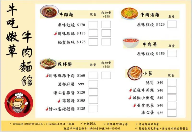 「牛吃嫩草牛肉麵館」的菜單品項不算多,因為老闆想把精力都放在他的牛肉麵上啦。 不過除了招牌牛肉麵,他們也有乾拌麵跟一些小菜可以選。 牛肉麵最便宜從170元開始。 最讚的是,牛肉麵可以免費加湯加麵一次喔。 如果你喜歡吃細麵,點餐時也可以跟櫃台人員說要換。