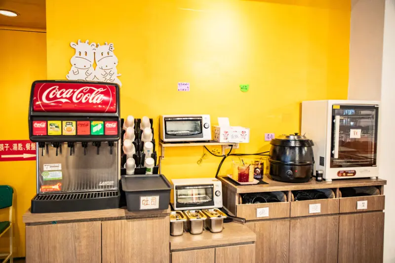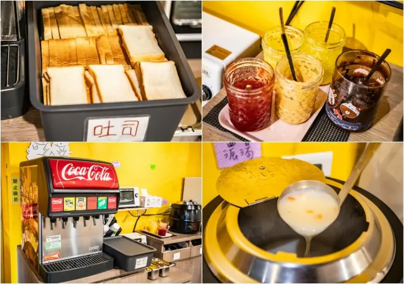 這裡是用餐採自助式的,吃完記得自己把餐盤收到回收區喔。 自助吧區域就是剛剛說的,有汽水機可以無限暢飲,還有提供西式的濃湯跟五種口味的抹醬讓你現烤土司吃到飽,這些通通都是免費讓你用到飽的喔。