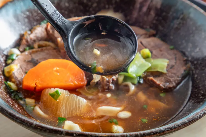 我去的時候剛好看到老闆正在熬牛肉湯,老闆是真的直接把牛腱肉丟下去一起滷,還加了超多蔬果一起熬煮來提鮮。 重點是完全沒有加化學調味料,熬出來的牛肉湯香氣超濃郁的啦。
