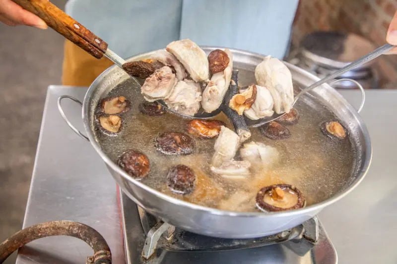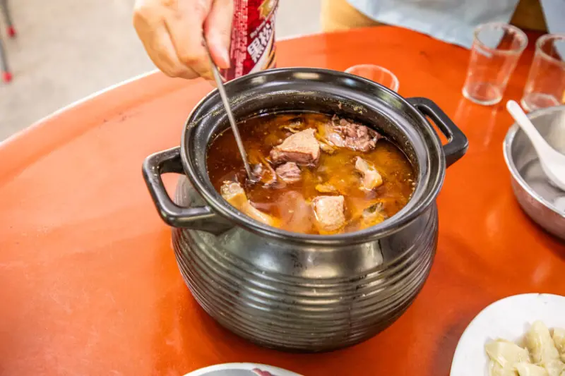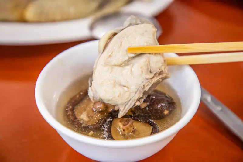 再來是半隻香菇雞,這也是一端上來就是一大鍋,份量爆炸多。裡面的香菇也不是意思意思放幾朵,是直接抓了一大把丟進去煮,老闆娘說要放在小瓦斯爐上滾久一點湯才會更好喝。裡面放的是半隻雞,老實說根本吃不完啦! 除了香菇,還加了醃冬瓜進去提鮮,讓雞湯喝起來更鮮甜喔。這雞湯看起來好像很濃郁,但喝起來卻是清爽又回甘,香菇的香氣也很濃。雞肉份量給得很大方,香菇是整朵的,吃起來很多汁。不過稍微可惜一點的是雞胸肉煮湯會比較柴,雞腿肉的部分就好多了,但整體來說,這鍋雞湯還是相當好喝,而且很大鍋又便宜。