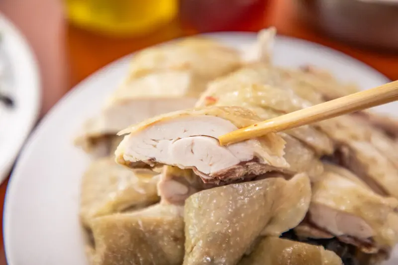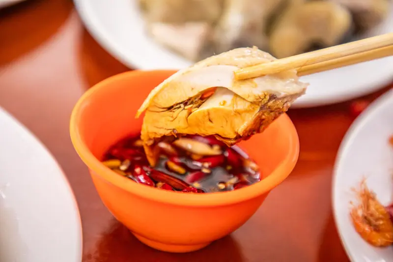 先說說那個半隻白斬雞吧,雖然說是半隻,但這雞真的很大隻,份量快要跟別家的一整隻雞差不多了。它的雞皮屬於那種薄薄的,吃起來完全沒有油膩感,雞肉本身又甜又清爽,口感超級嫩的,真心是好吃的白斬雞啊!白斬雞的靈魂就在沾醬啦,他們家的蒜頭辣椒醬油真的太強了,應該是我目前吃過數一數二厲害的白斬雞沾醬。蒜頭跟辣椒的香氣超足夠,而且醬油完全不死鹹,還帶有一點點淡淡的豆香,搭配嫩嫩的白斬雞,簡直是天作之合!
