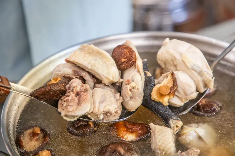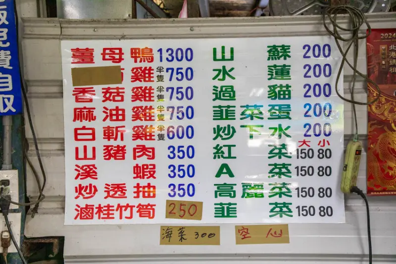 再來看看安安土雞城的菜單吧,價格定位大概是中低價位啦。來到這裡,我強烈建議必點的有香菇雞、白斬雞、山豬肉、溪蝦、桂竹筍、山蘇,還有薑母鴨。他們的土雞都是賣半隻的,所以點一隻雞就可以選兩種煮法,像是半隻做白斬雞、另外半隻煮雞湯這樣是可以的喔。他們家的薑母鴨一鍋要價1300元,我一開始看到價格有小嚇一跳,但等真的端上桌後,秒懂為何值這個錢了。