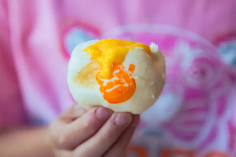 厲害的是不同節日還會做不同造型,像最近萬聖節快到了,就有萬聖節的裝飾,超有過節氣氛。流沙包的外皮很軟,裡面的內餡是鹹鹹甜甜的鹹蛋黃口味,輕輕撕開,裡面的餡就會像流沙一樣流出來,口感濃郁,鹹甜交織超好吃。