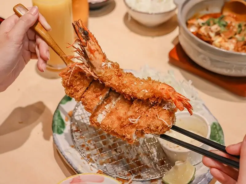 它視覺看起來很厲害,吃起來也是一種享受喔。銀座杏子日式豬排的豬排是用麵包粉去炸的,所以炸出來的外皮真的特別酥脆。這個大里肌豬排裡面還夾著起司,所以你每一口咬下去,都可以同時吃到肉的鮮嫩跟濃郁的起司香氣。裡面的生蒜味道是點綴用的,不會太搶味。旁邊還有一隻手掌一樣長的草蝦,讓你海陸一次滿足啦。它會附上塔塔醬,那個酸酸香香的口味,搭配豬排或草蝦都很好吃,會讓人一口接一口停不下來。他們的豬排醬也蠻特別的,是微酸的口感,也很值得試試看。