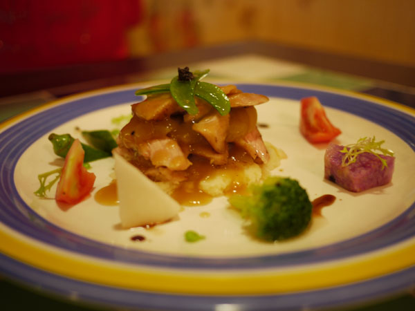 香甜的焦糖蘋果配上富彈性的松阪豬肉,松阪豬在口中越咀嚼越散發出的油脂香,跟著一同入口鬆軟的焦糖蘋果,香甜清爽的果香搭上松阪豬,不斷咀嚼下所散發的香味,令人驚訝松阪豬也能有如此清爽的味道。